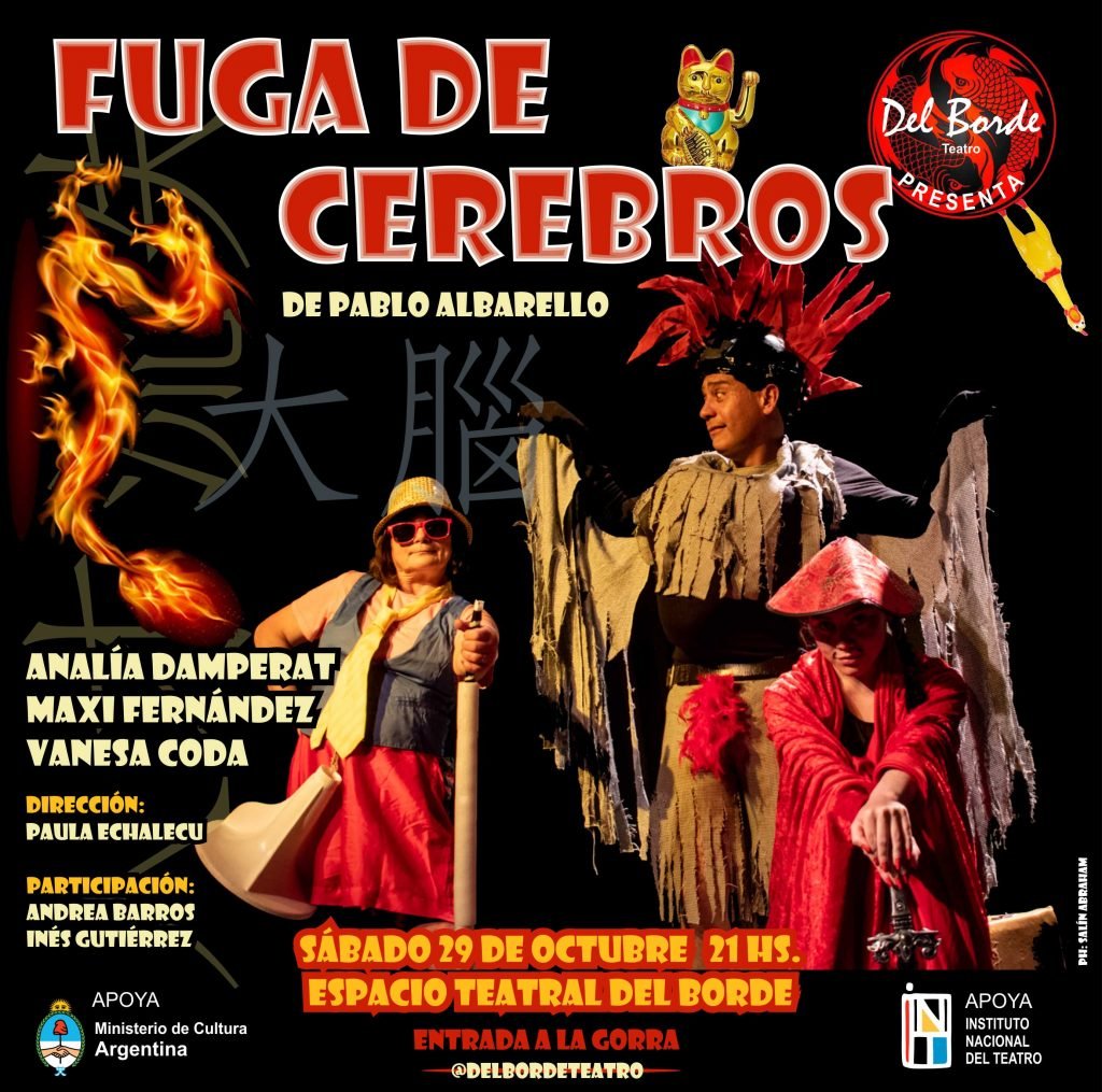 El próximo sábado 29 a las 21 Hs., en el Espacio Teatral Del Borde, se estrenará el espectáculo humorístico Fuga de Cerebros, basado en texto original de Pablo Albarello, con actuaciones de Analía Damperat, Maximiliano Fernández y Vanesa Coda, con participaciones especiales de Andrea Barros y María Inés Gutiérrez, acompañados por la dirección de Paula Echalecu.