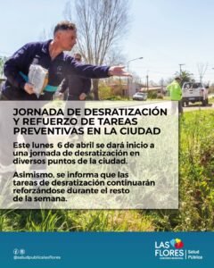 La Secretaría de Salud de la Municipalidad de Las Flores informa que este lunes se dará inicio a una jornada de desratización en diversos puntos de la ciudad. La actividad se concreta a partir de las gestiones realizadas por la Dirección de Bromatología ante el Ministerio de Salud de la Provincia de Buenos Aires, contando con la presencia de personal técnico del Departamento de Control de Vectores y Plagas de la Dirección Provincial de Epidemiología y de Información Sistematizada para el despliegue del operativo.