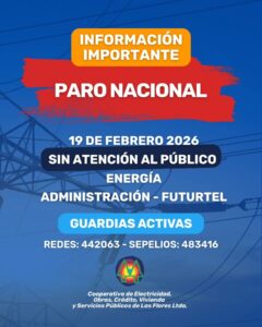 Por otra parte, la Cooperativa de Electricidad informó ayer que hoy no tendrá atención al público en ninguna de sus oficinas, garantizando solo guardias mínimas. (Ver comunicado al pie)