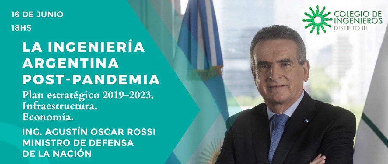 El encuentro digital es denominado “La ingeniería argentina post-pandemia” y se charlarán conceptos sobre el Plan Estratégico 2019-2023 y sobre infraestructura y Economía y disertará el Ingeniero Agustín Rossi, Ministro de Defensa de la Nación.