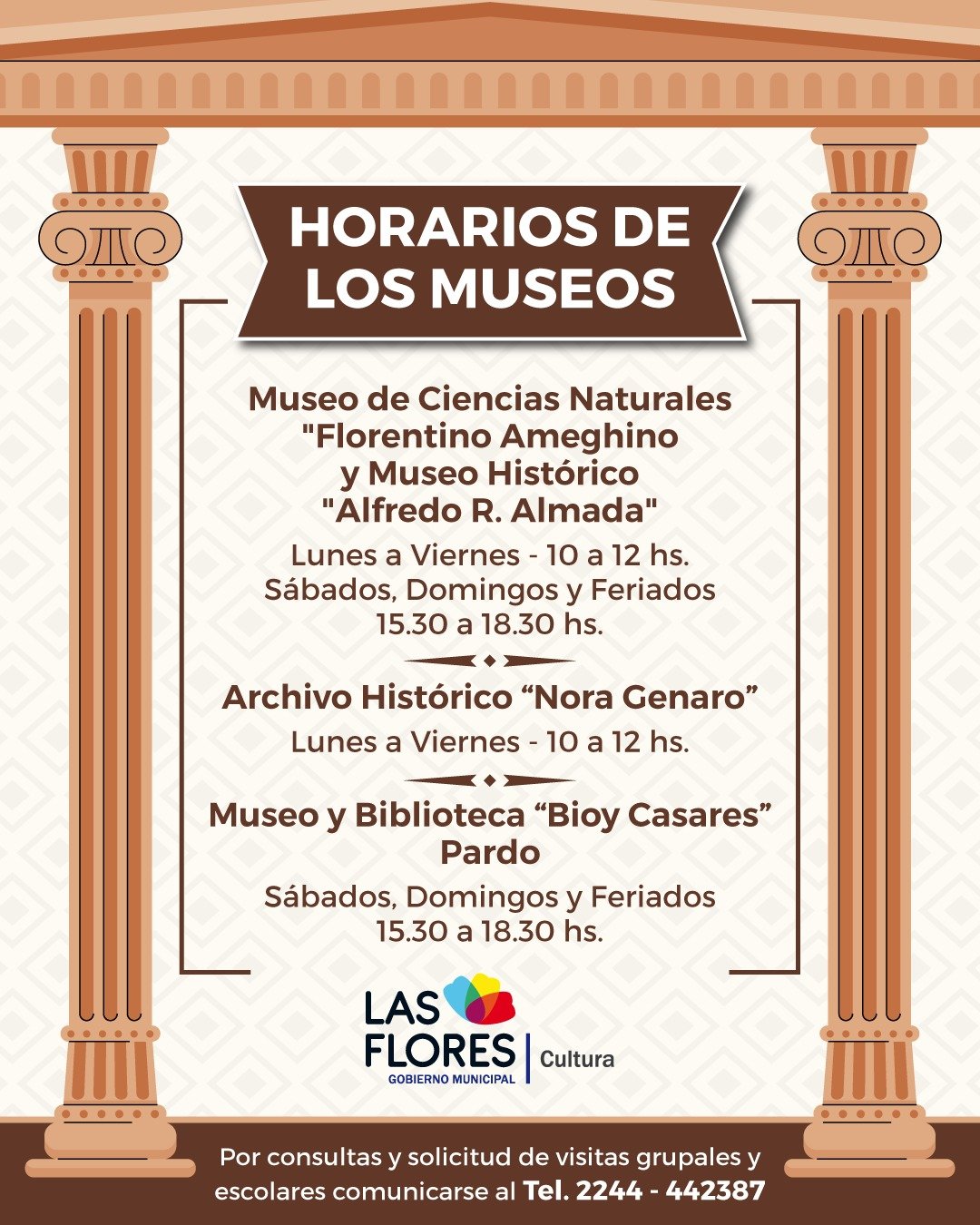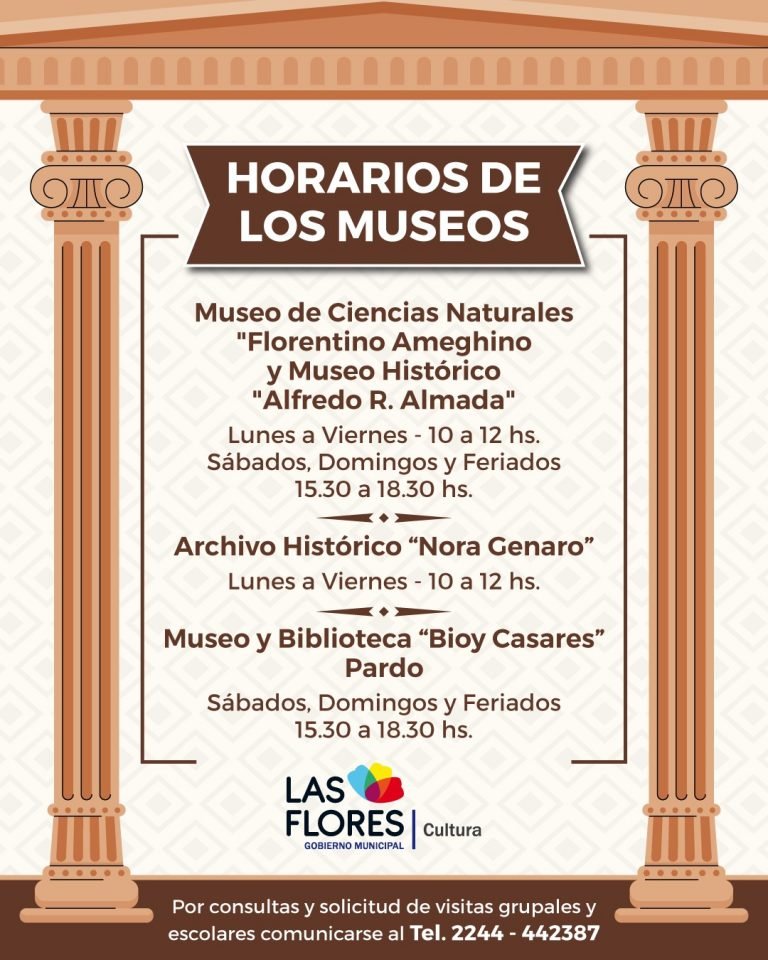 La Secretaría de Cultura de Las Flores informa que los horarios de apertura y visita de los museos y archivo son los siguientes: