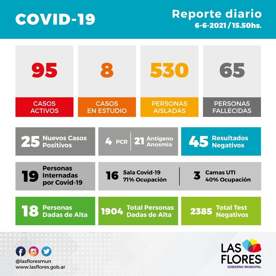 Ingresaron nuevos resultados arrojando 25 positivos, 4 por medio de hisopados PCR y 21 por test de antígeno, anosmia y 45 resultados negativos.