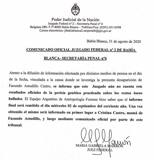 La madre de Facundo, Cristina Castro, informó hace instantes que «hasta el miércoles» no estarán disponibles los resultados del ADN realizado a los restos hallados el 15 de agosto en Villarino Viejo.