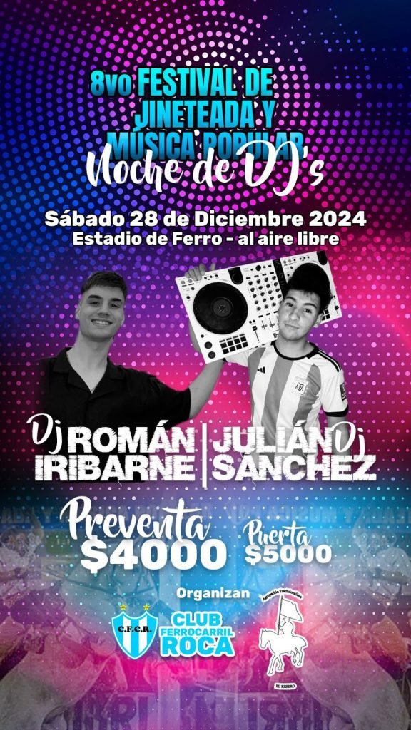 Este sábado 28 de diciembre en el Club Ferro se realiza la «8va gran fiesta de jineteada y música popular». Desde las 21 hs la comisión del club junto con la agrupación El Resero invitan a disfrutar de la jineteada nocturna con destrezas criollas y shows artísticos. Además con la adquisición de la entrada preventa se participa del sorteo de un “Freezer ensillado”.