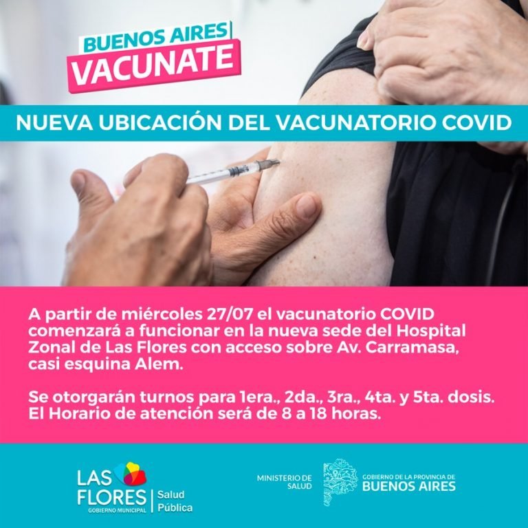 La Secretaría de Salud Pública informa que a partir de mañana miércoles 27 de julio el vacunatorio COVID comenzará a funcionar en la nueva sede del Hospital Zonal de Las Flores con acceso sobre Av. Carramasa, casi esquina Alem.