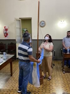 Luego de la lectura del Decreto de convocatoria por parte de la Secretaria Ariana Pertusi, los concejales Graciana Goicoechandía (GEN-1 País) y Federico “Luky” Alejandro (Juntos por el Cambio) izaron la Bandera Nacional.
