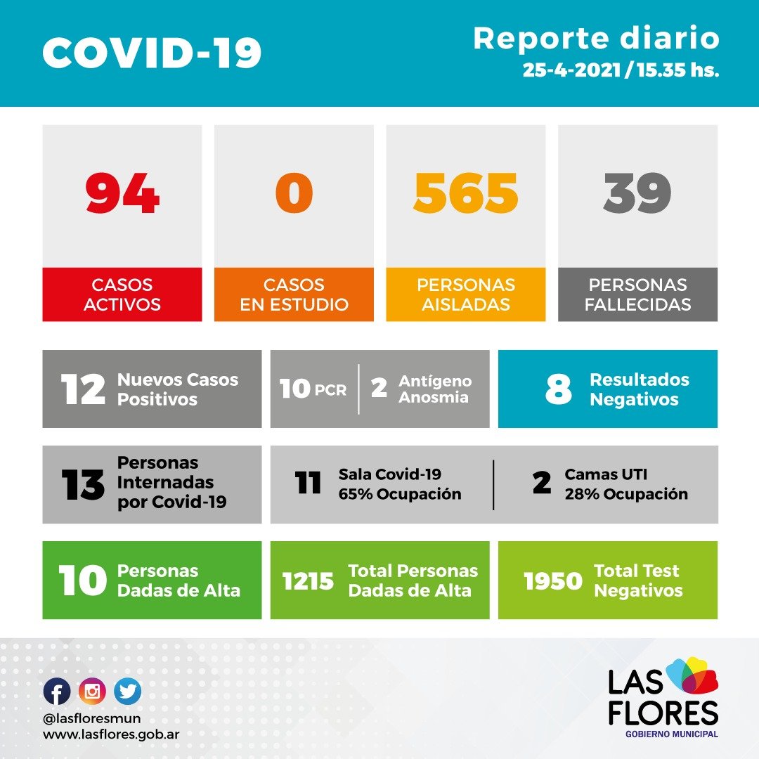 Este domingo se informaron nuevos resultados de análisis por Covid arrojando 12 casos positivos, 10 por medio de hisopados PCR y 2 por test de antígeno, anosmia y 8 resultados negativos, mientras que en las últimas horas se dieron de alta a 10 pacientes activos.