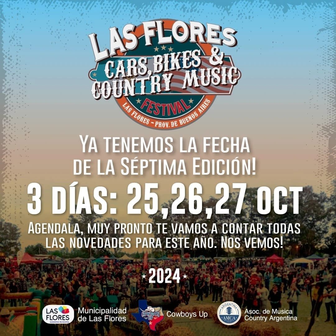 Con el apoyo de la municipalidad de Las Flores y auspiciado por Cowboys up y Asociación de música Country Argentina, la septima edición de «Las Flores Cars, bikes & country music» promete ser un gran programa para toda la familia con entrada libre y gratuita.