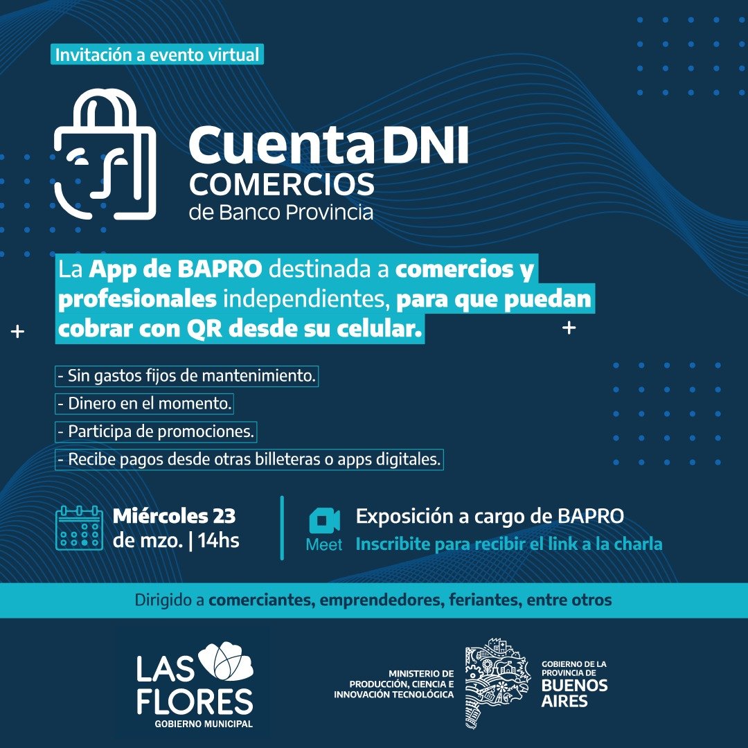La Secretaría de Desarrollo Productivo y Sustentable convoca al encuentro virtual, que se desarrollará este miércoles 23 de marzo a las 14 hs. brindado por el Banco de la Provincia de Buenos Aires sobre el uso de la APP Cuenta DNI Comercios, destinada a profesionales independientes, emprendedores, feriantes y comercios para que puedan operar desde su celular.