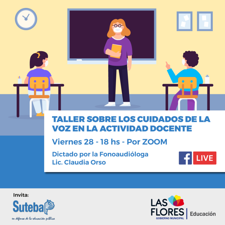 La Secretaría de Educación de la Municipalidad de Las Flores y Suteba, invitan al personal docente y alumnos/as de los diferentes profesorados, a participar del encuentro virtual que estará a cargo de la Fonoaudióloga Lic. Claudia Orso, sobre “la importancia del cuidado de la voz en la actividad docente”.