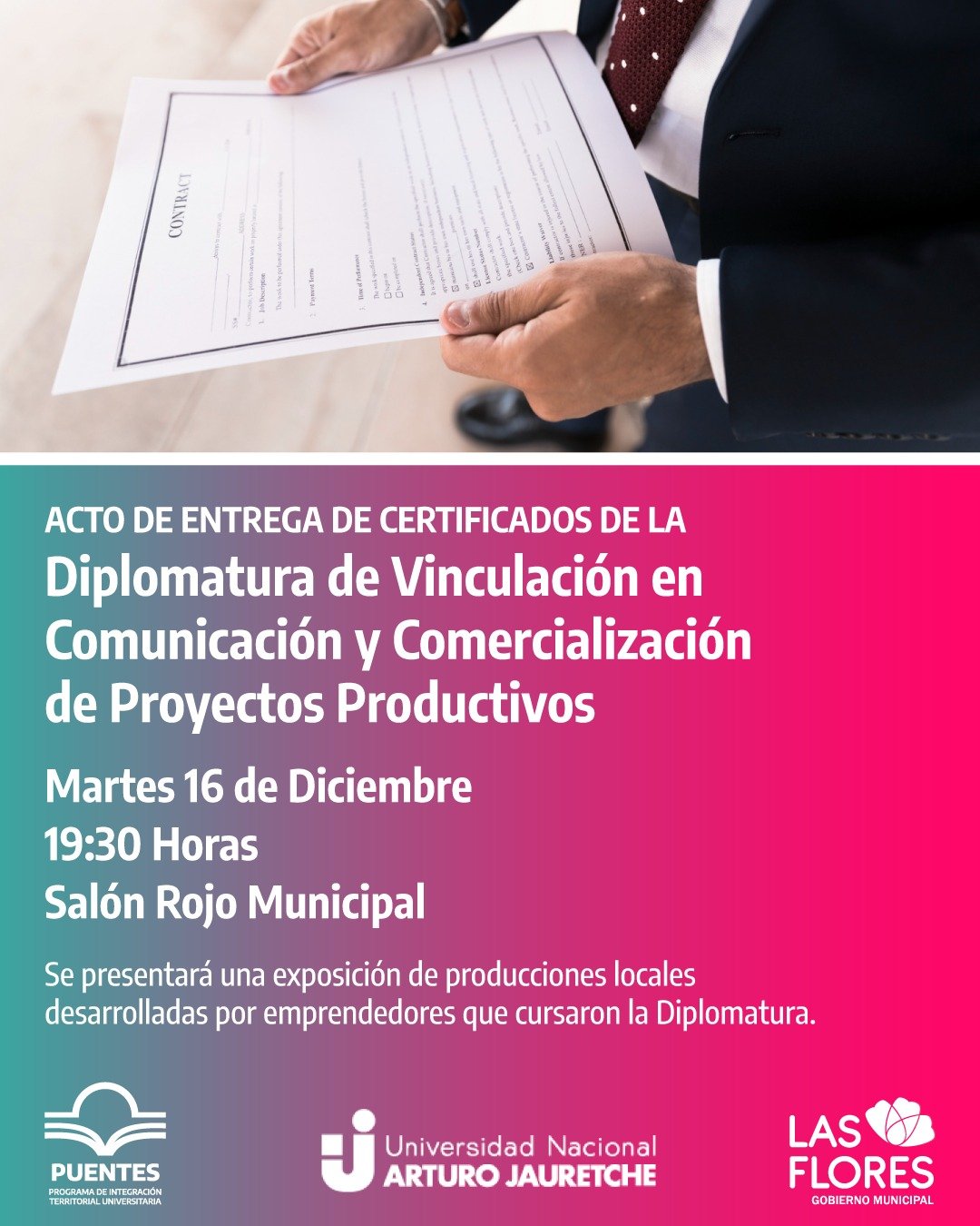 La Municipalidad de Las Flores invita a toda la comunidad a participar del Acto de Entrega de Certificados de la Diplomatura de Vinculación en Comunicación y Comercialización de Proyectos Productivos, dictada en nuestra ciudad por la Universidad Nacional Arturo Jauretche (UNAJ) a través del Programa PUENTES.