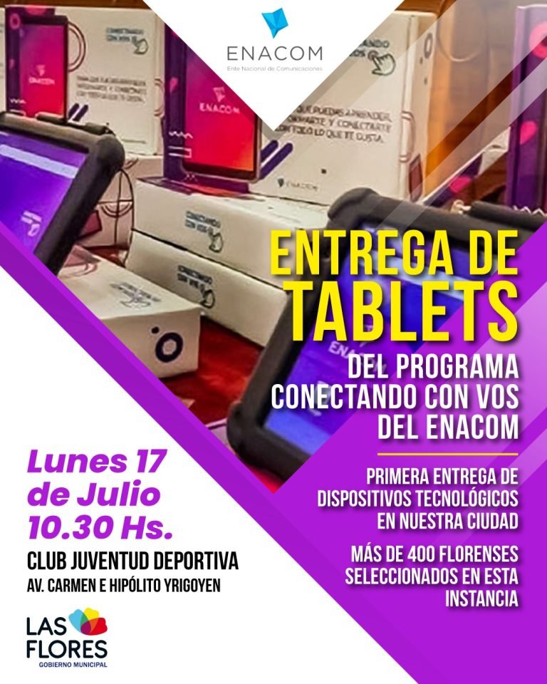 El próximo lunes 17 de julio a las 10.30 horas en el Club Juventud Deportiva, más de 400 florenses recibirán Tablets que llegan a partir de gestiones realizadas ante el ENACOM (Ente Nacional de Comunicaciones) mediante el programa “Conectando con Vos”.