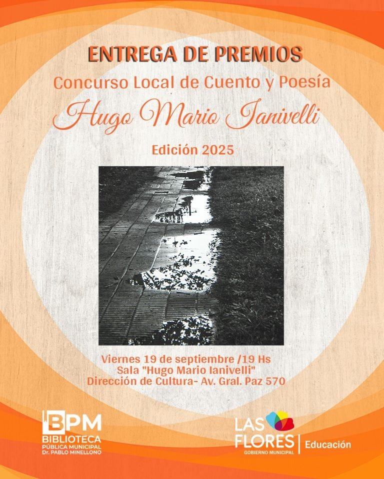 La Secretaría de Educación y la Biblioteca Pública Municipal Dr. Pablo Minellono invitan a la comunidad a la ceremonia de Entrega de Premios de la edición 2025 del concurso “Hugo Mario Ianivelli” que se llevará a cabo el 19 de septiembre a las 19 horas en la Dirección de Cultura, ubicada en Av. Gral. Paz 570.