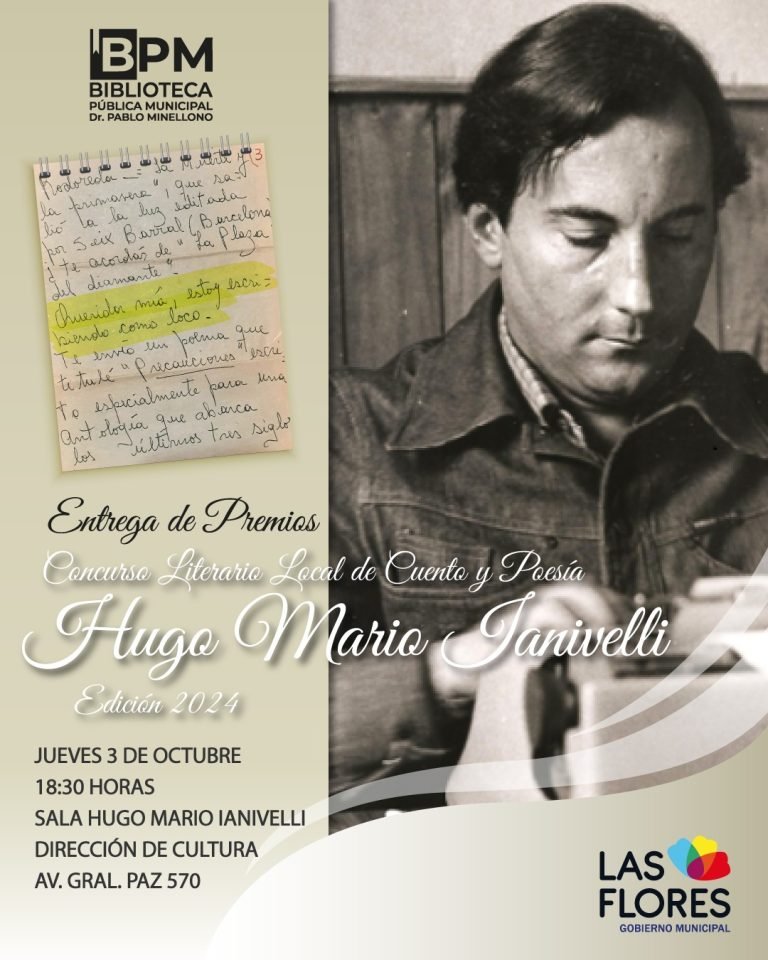 La Secretaría de Educación y la Biblioteca Pública Municipal “Dr. Pablo Minellono”, invitan a la entrega de premios del Concurso Local de Cuento y Poesía Hugo Mario Ianivelli – Edición 2024, que se realizará este jueves 3 de octubre a las 18.30 horas en la Sala “Hugo Mario Ianivelli” de la Dirección de Cultura (Av. Gral. Paz 570).