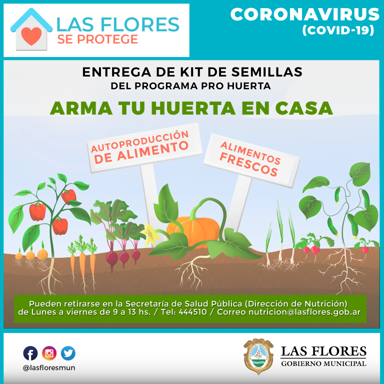 La Dirección de Nutrición de la Municipalidad de Las Flores informa que se encuentra trabajando junto a INTA Las Flores en el marco del Programa «Pro Huerta» con el objetivo de mejorar el acceso a los productos frescos y de éste modo lograr el autosustento familiar a mediano plazo, tan importante en este contexto actual.