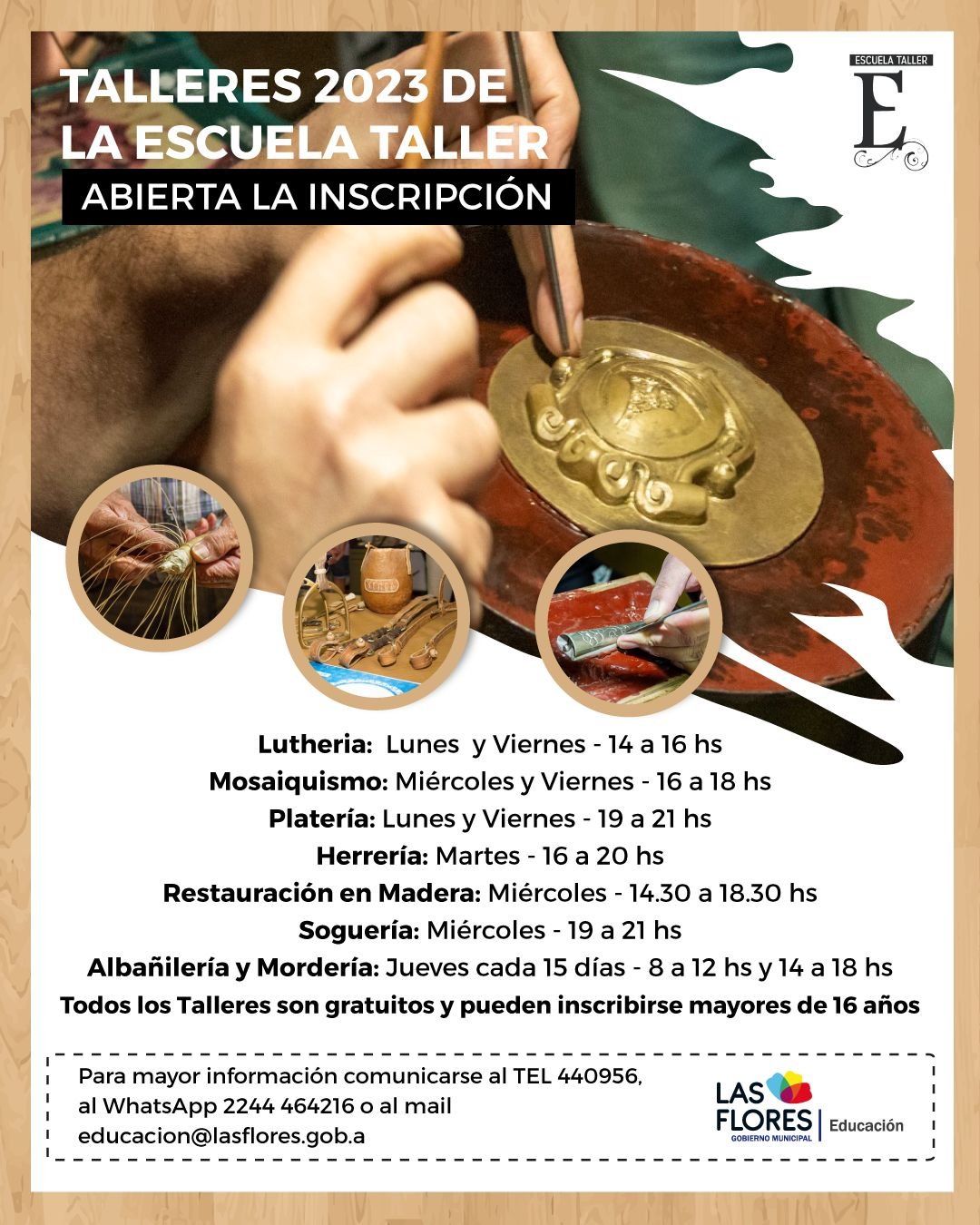La Secretaría de Educación de la Municipalidad de Las Flores informa que se encuentra abierta la inscripción a la Escuela Taller, institución orientada a la protección y conservación del Patrimonio Histórico Cultural.