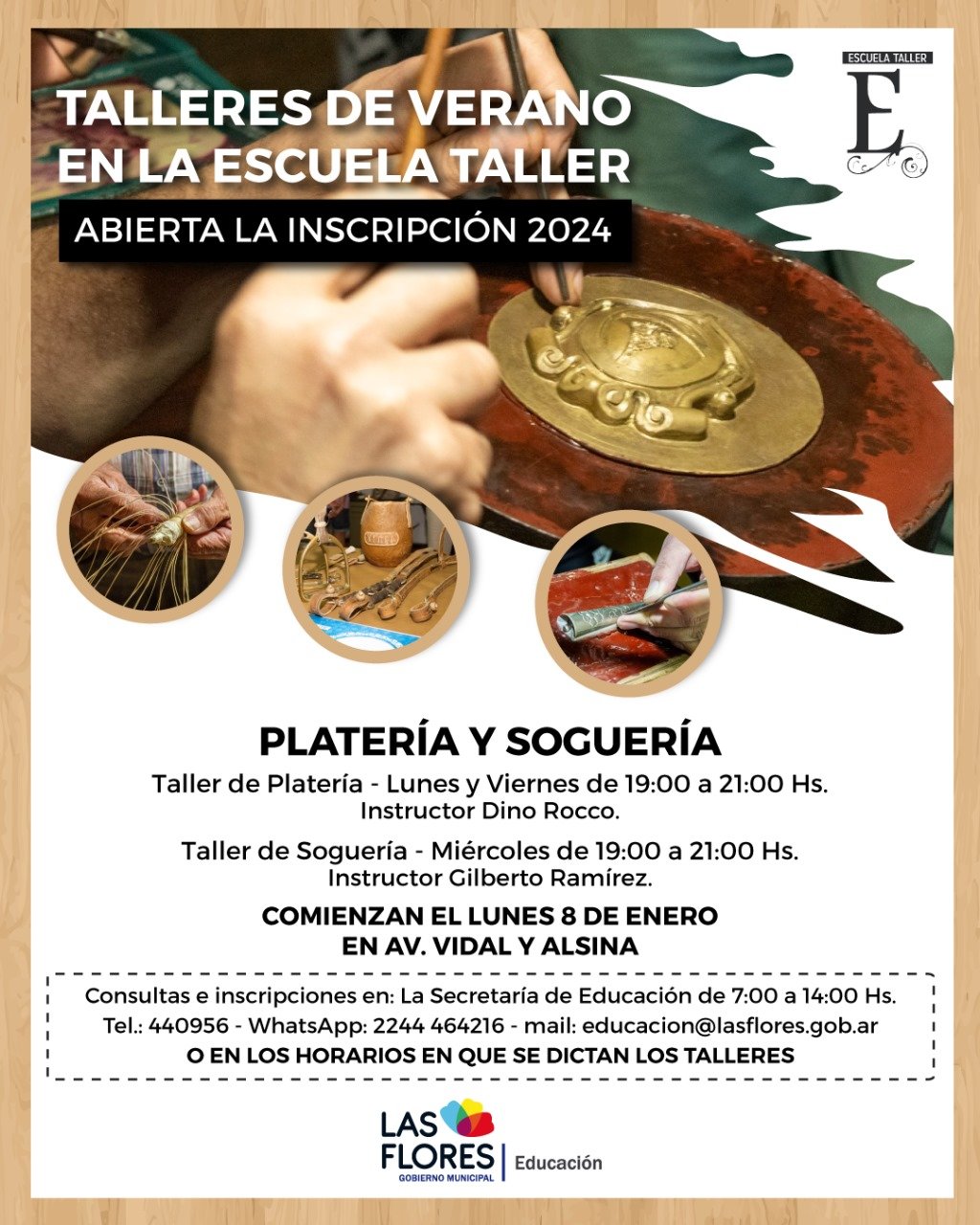 La Secretaría de Educación de la Municipalidad de Las Flores informa que se encuentra abierta la inscripción a los talleres de verano de la Escuela Taller, institución orientada a la protección y conservación del Patrimonio Histórico Cultural.