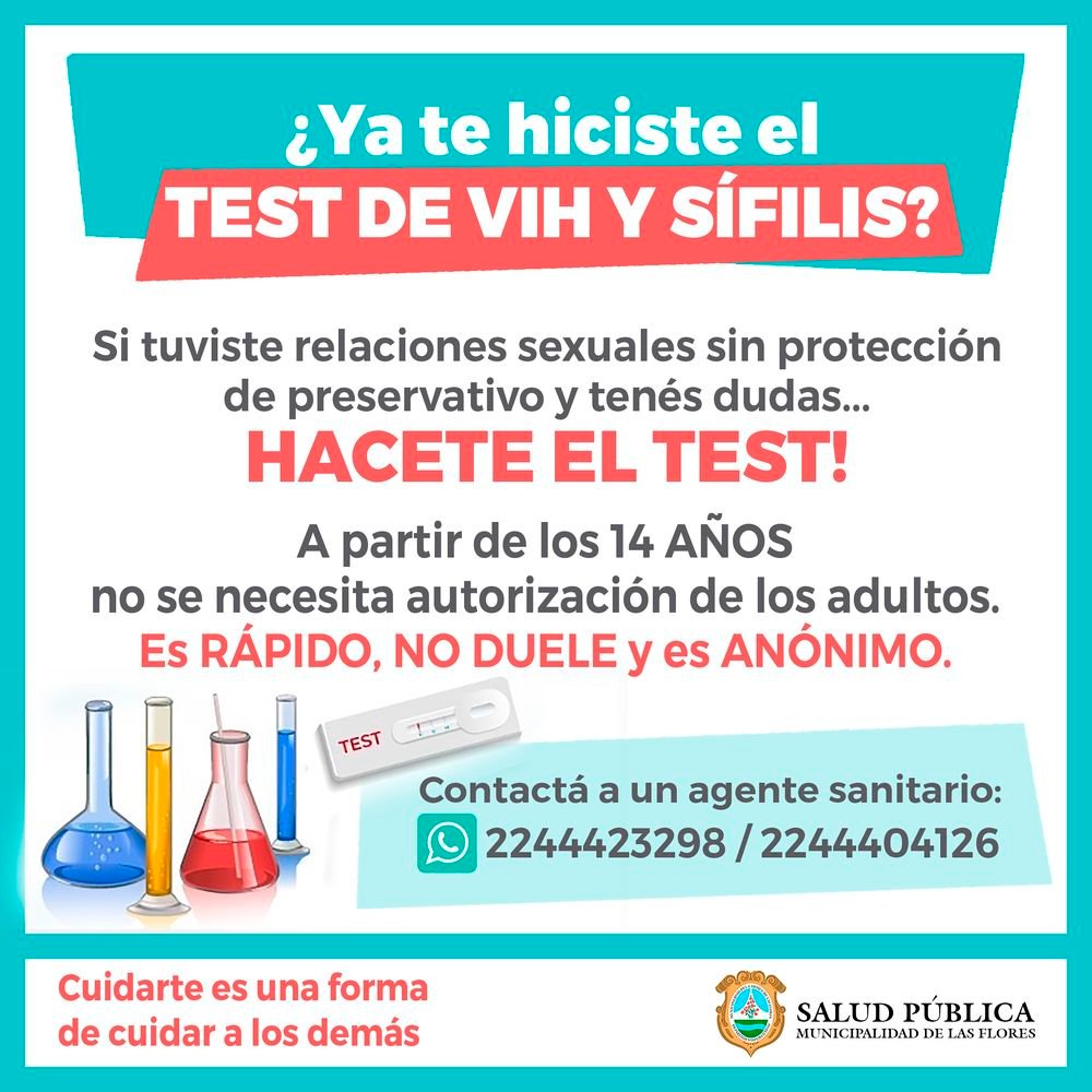 La Secretaría de Salud Pública pone a disposición de la comunidad test de VIH y Sífilis gratuitos. Los test son anónimos, rápidos y no causan ningún tipo de dolor. A partir de los 14 años no es necesario contar con la autorización de un adulto.