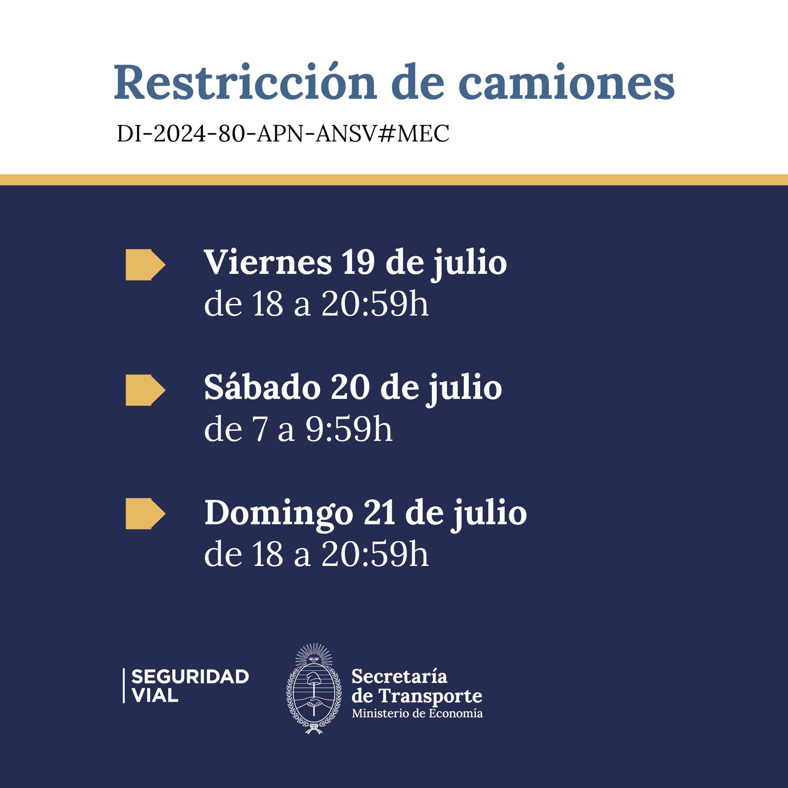 En la continuidad de las vacaciones de invierno, la Agencia Nacional de Seguridad Vial (ANSV) recuerda la vigencia de la restricción de circulación para camiones de más de 3.500 kilos durante este fin de semana.