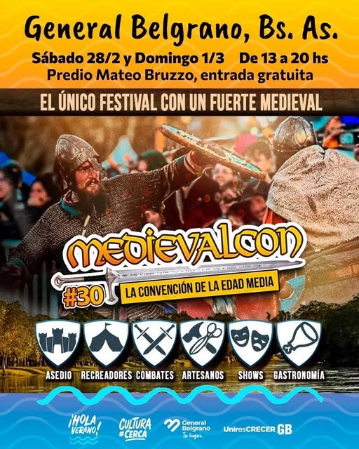 El evento medieval más grande de Argentina desembarca en General Belgrano. El parque Mateo Bruzzo se está convirtiendo en una aldea medieval y los espera a todos este sábado 28 de febrero y domingo 1 de marzo desde las 13 y hasta las 20 hs.
