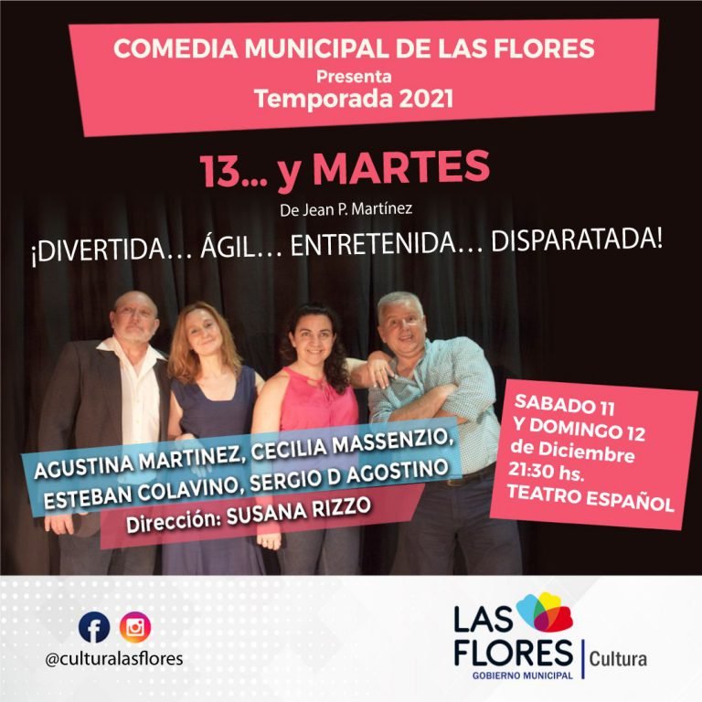 Este sábado 11 y el domingo 12 de diciembre a las 21.30 hs, volverá a ponerse en escena una nueva presentación de la Comedia Municipal con la obra teatral 13…. Y MARTES del autor Jean P. Martínez.