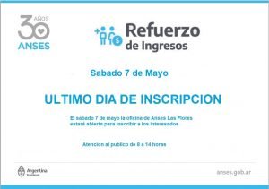 Asimismo, se recuerda que la inscripción al Refuerzo de Ingresos continuará habilitada en la página oficinal www.anses.gob.ar las 24 horas, hasta el sábado 7 de mayo inclusive.