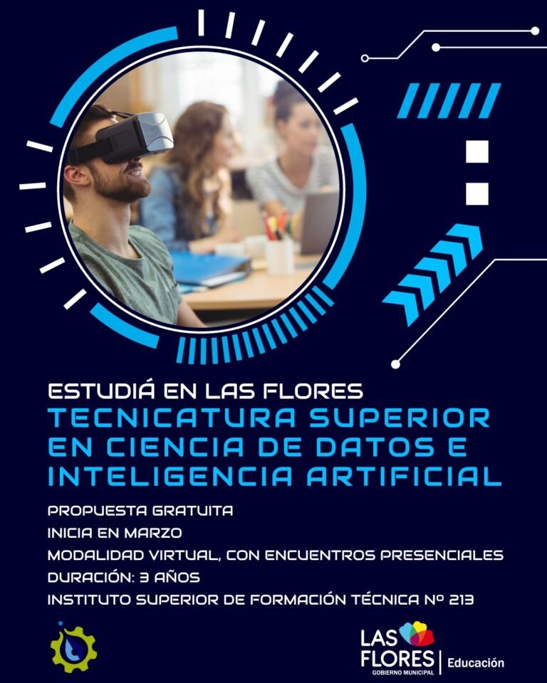 La Secretaría de Educación y Cultura de la Municipalidad de Las Flores informa que se encuentra abierta la INSCRIPCIÓN a la Tecnicatura Superior en Ciencia de Datos e Inteligencia Artificial del Instituto de Formación Técnica Nº 213; gratuita y de modalidad virtual con encuentros presenciales.