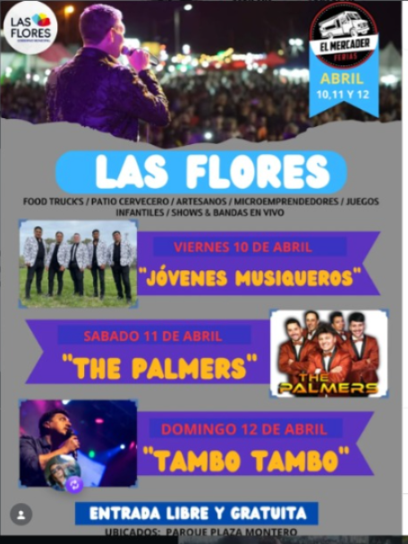 Vuelve a Las Flores el evento que reúne gastronomía, emprendedores y música en vivo. El 10, 11 y 12 de abril el Parque Plaza Montero recibe a FERIA EL MERCADER, desde las 11 y hasta la una de la mañana podremos recorrer los stands de artesanos, food tracks, patio cervecero, juegos infantiles y disfrutar de shows musicales en vivo, todo con entrada libre y gratuita