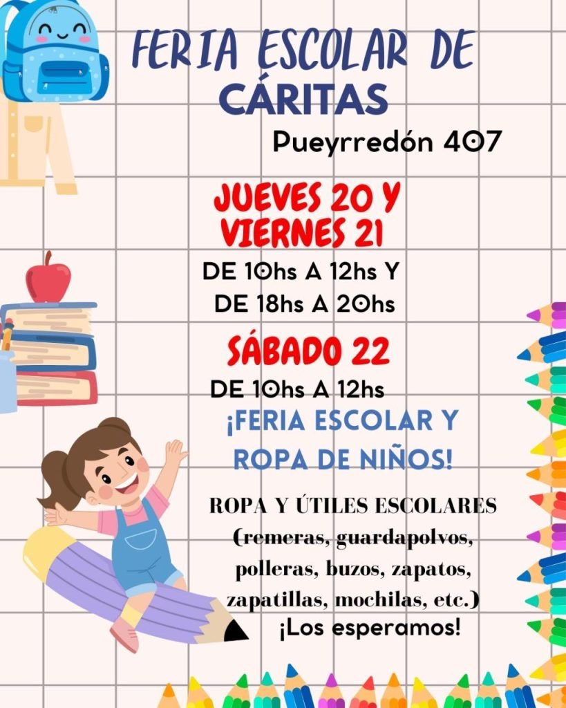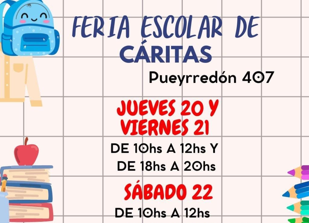 Colaborando con la comunidad educativa desde el punto de vista económico, y ante la dificil situación actual, en la sede local de Cáritas ese ha organizado una feria escolar que comenzó ayer y continúa hoy viernes y sábado. Habrá venta a muy buen precio de ropa y útiles escolares (remeras, guardapolvos, polleras, buzos, zapatos, zapatillas, mochilas, etc.).
