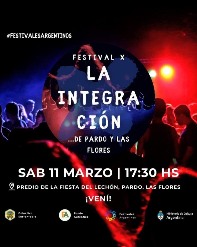 El sábado 11 de marzo a las 17:30 hs en la localidad de Pardo se realizará el «Festival por la integración de Pardo y Las Flores». El mismo será en el predio de la fiesta del lechón y habrá poesía, danzas, feria de emprendedores, artesanos, patio gastronómico y acompañará al festival el Grupo Eco (conciencia ambiental).