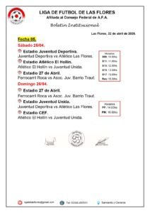 Tal cual lo indicado en el informe oficial de la Liga local, se disputará toda la fecha de todas las divisiones entre sábado y domingo. Las inferiores del sábado de sub 9 hasta reserva enfrentarán a Juventud Deportiva vs Atlético; El Hollín vs Juventud Unida y Ferro vs Barrio Traut.