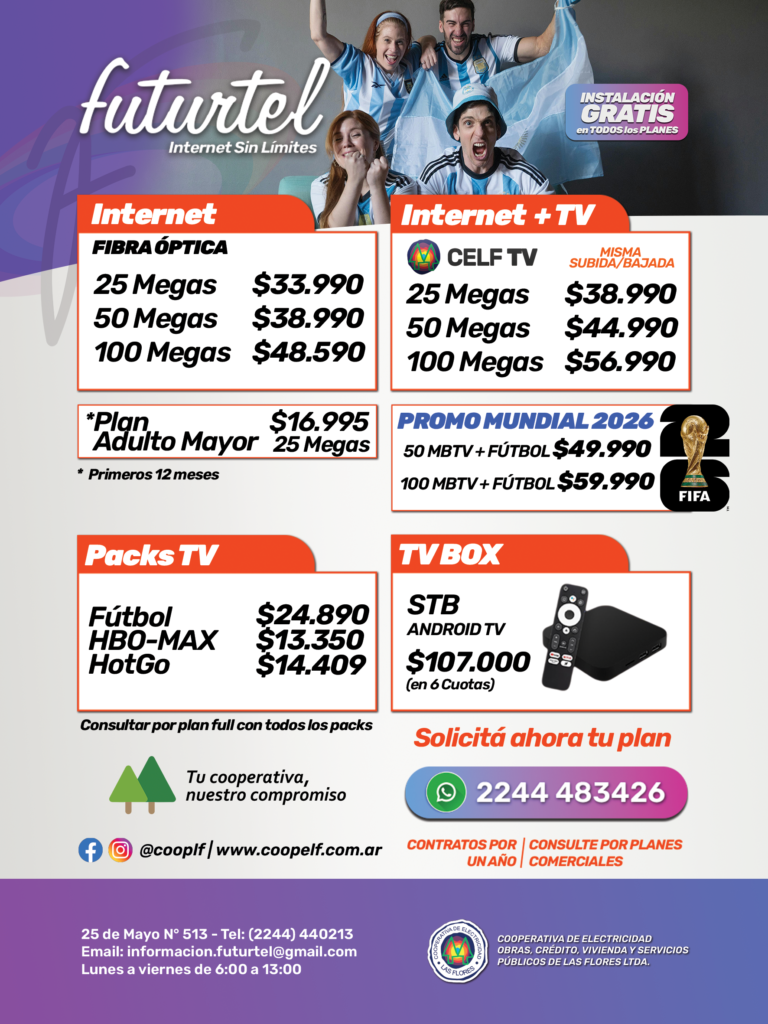 La Cooperativa de Electricidad de Las Flores, a través de su área de Telecomunicaciones Futurtel, informa a sus asociados la actualización de los planes de internet, telefonía y servicios combinados, vigente a partir de junio de 2026.