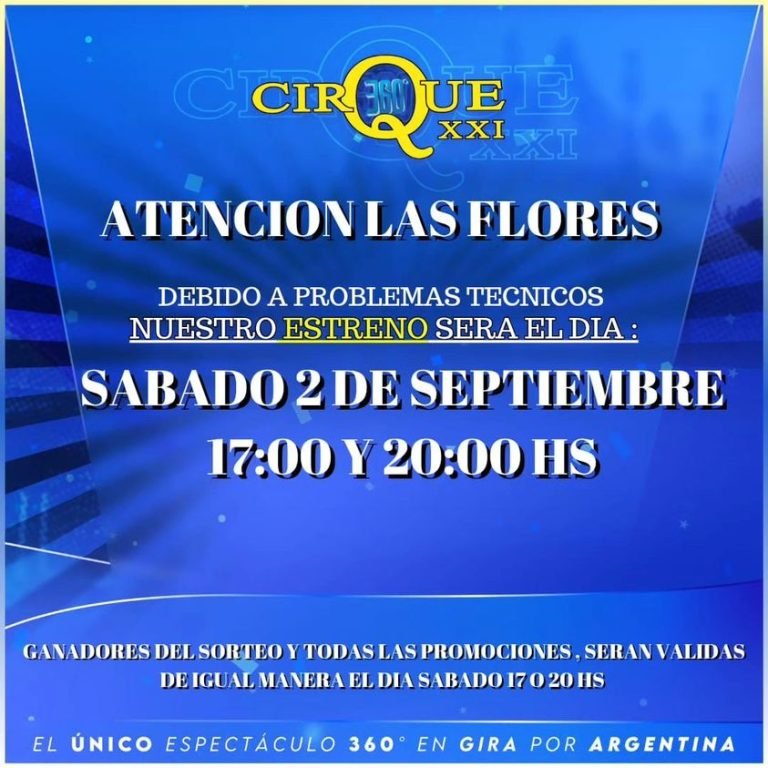 Este fin de semana estrena su espectáculo en Las Flores, el prestigioso “Cirque XXI”. En Frecuencia Personal, Gabriel, representante del circo, informó que el estreno programado para esta noche de viernes, debió postergarse para mañana sábado 2 de septiembre por un inconveniente técnico.