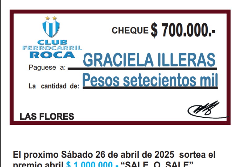 El Club Ferrocarril Roca dio a conocer el ganador del sorteo del bono contribucion correspondiente al mes de marzo 2025. Con el número 8134, la beneficiada fue Graciela Illeras que se adjudicó $700.000, el pasado sábado 29 de marzo.