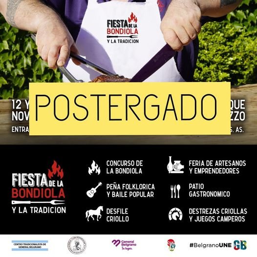 lluvias para este fin de semana, se informa que la “Fiesta de la Bondiola y la Tradición” se POSTERGA para el mes de Diciembre».