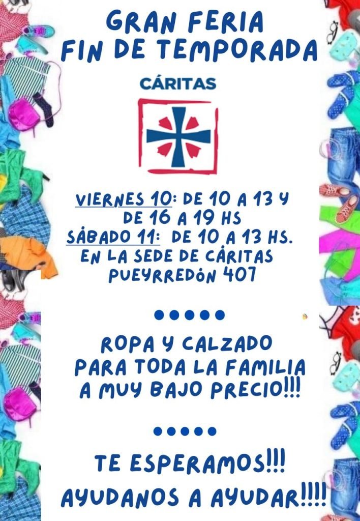Compartir WhatsApp Facebook Twitter Telegram Email LinkedIn Copy Link Este fin de semana Caritas hace una gran feria fin de temporada.Prendas para toda la familia a muy bajos precios. Acercate el viernes 10 de octubre de 10 a 13 hs y de 16 a 19 hs. y el sábado 11 de 10 a 13 hs en la sede de caritas, Pueyrredón 407.7