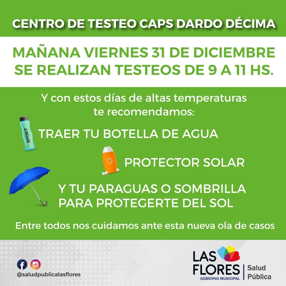 La Secretaría de Salud Pública Informa que el centro de testeo del Centro de Atención Primaria de la Salud «Dardo Décima», funcionará hoy viernes 31 de diciembre de 9 a 11 hs.