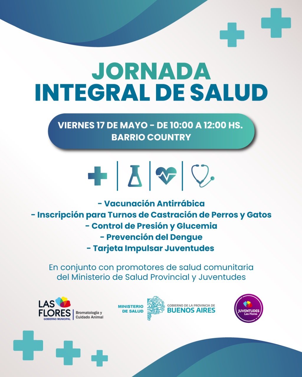 Desde la Dirección de Bromatología y Cuidado Animal se informa que este viernes 17 de mayo se llevará a cabo una nueva Jornada Integral de Salud donde se trabajará junto al Área de Juventudes y Promotores de Salud Comunitaria del Ministerio de Salud de la provincia de Buenos Aires.