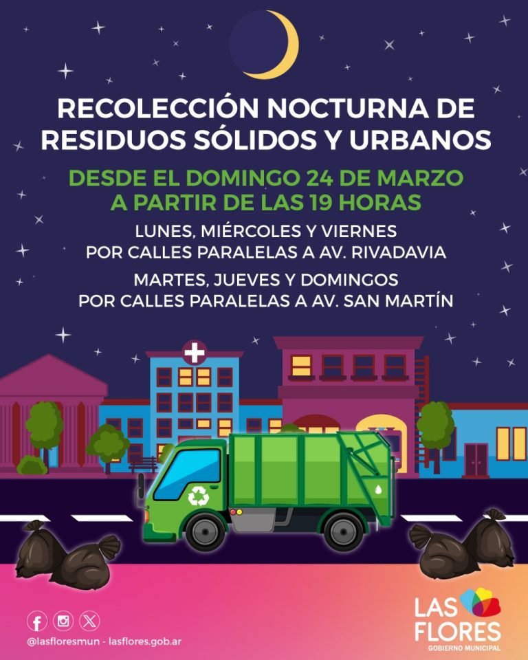 La Municipalidad de Las Flores informa que a partir del domingo 24 de marzo la recolección nocturna de residuos domiciliarios cambia su horario y se realizará desde las 19 horas.