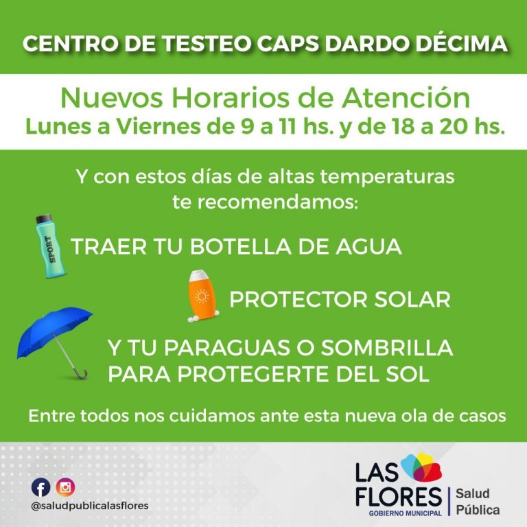 Informamos que el centro de testeo del CAPS Dardo Décima, funcionará desde mañana, jueves 30 de diciembre de lunes a viernes, en su nuevo horario de 9 a 11 hs y de 18 a 20 hs el cual se encuentra ubicado en las intersecciones de las calles Belgrano y Sordeaux.