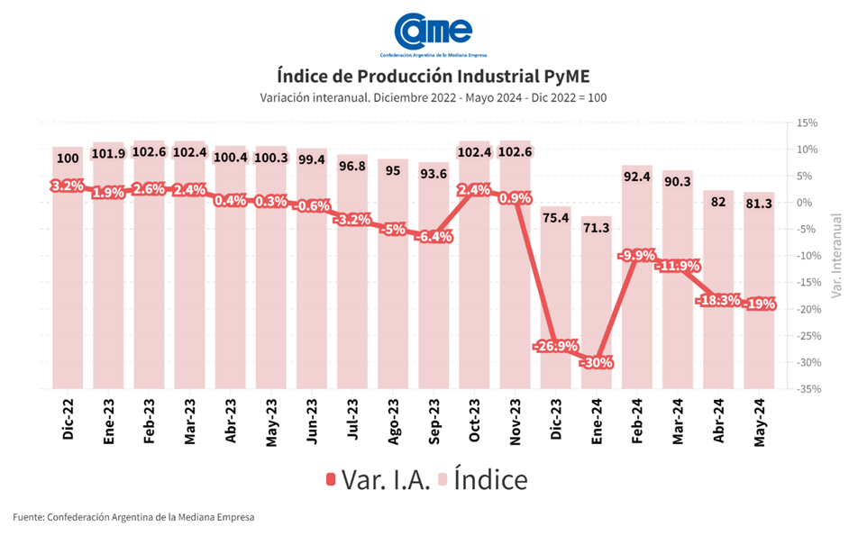 Según el informe mensual de la Cámara Argentina de la Mediana Empresa la actividad manufacturera de las pymes descendió 19% anual en mayo y acumula una retracción de 19,1% en los primeros cinco meses del año frente al mismo periodo de 2023.