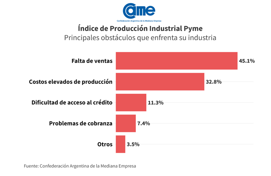 Asimismo, los mayores desafíos identificados por los empresarios son la falta de ventas, representando el 45,1% de las respuestas, y los altos costos de producción y logística, que constituyen el 32,8%. Estos dos factores sobresalen como los obstáculos más considerables para el crecimiento y la estabilidad de las pymes.