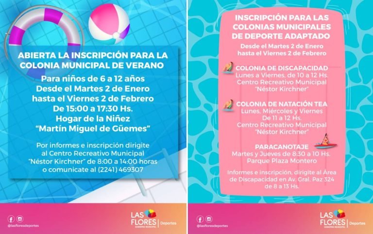 La Municipalidad de Las Flores, por intermedio de la Secretaría de Deportes informa que se encuentra abierta la inscripción para la Colonia Municipal de Vacaciones que funcionará en el Hogar de la Niñez “Martín Miguel de Güemes”, a cargo de profesores de la mencionada área y cuerpo de guardavidas.
