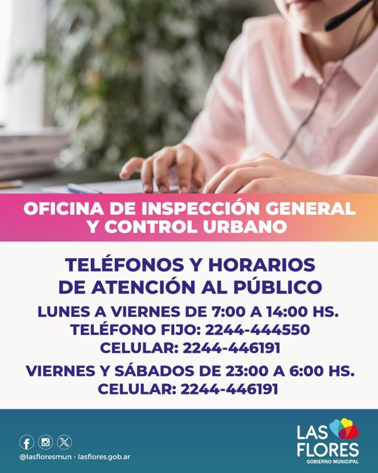 Desde la Municipalidad de Las Flores se informa sobre los días, horarios y teléfonos del área de Inspección General y Control Urbano para la recepción de reclamos y la atención de diversas cuestiones.