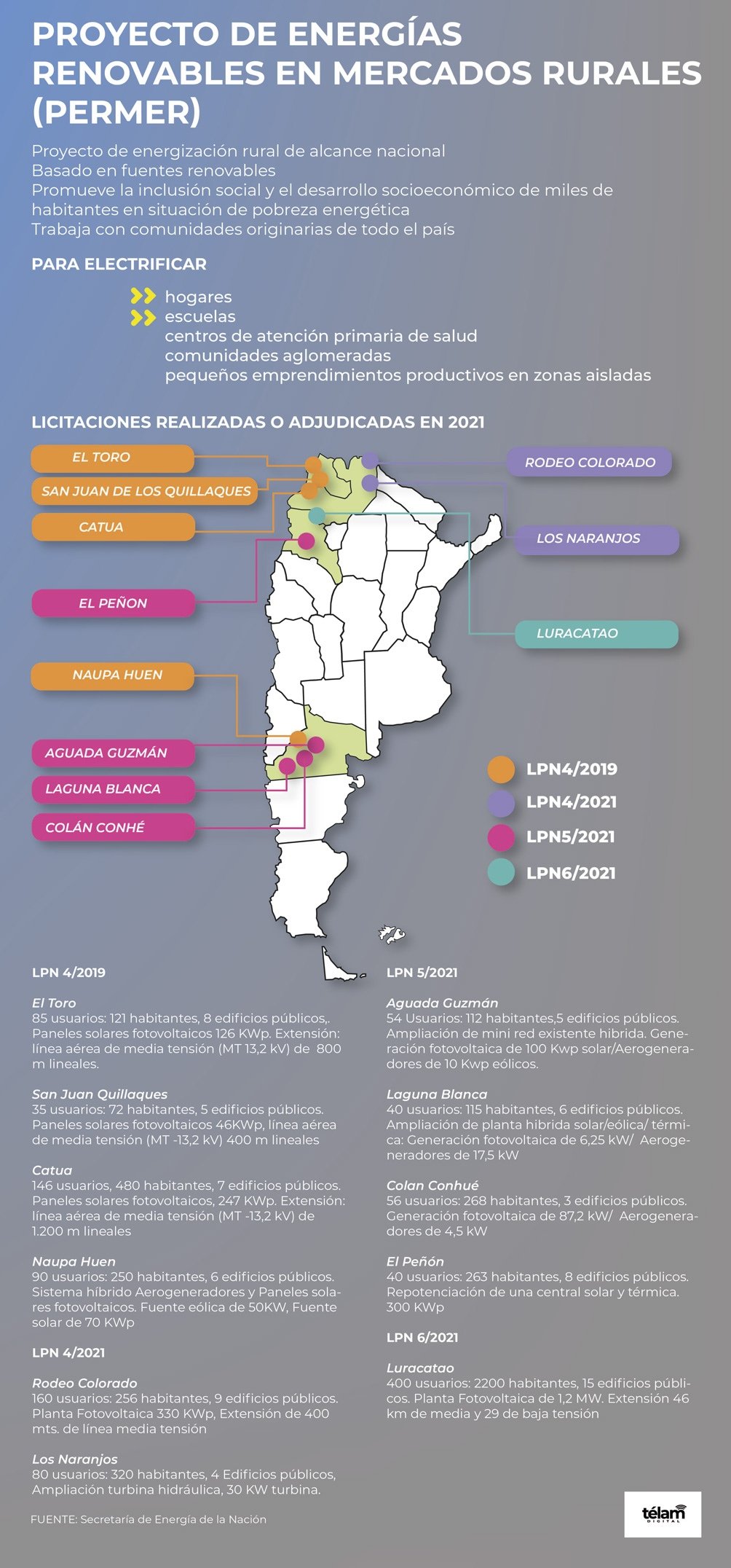 Las licitaciones involucran «el diseño, construcción o ampliación y operación inicial de las plantas generadoras de energías renovables, así como de las conexiones con las redes existentes», como ser en el caso de la mini red de Luracatao, con la construcción de «una planta fotovoltaica de 1,2 MW -la de mayor envergadura hasta el momento- que beneficiará a 400 familias en seis parajes del Valle de Luracatao y abastecerá a nueve escuelas, cuatro postas sanitarias, un destacamento policial, iglesias y centros vecinales».