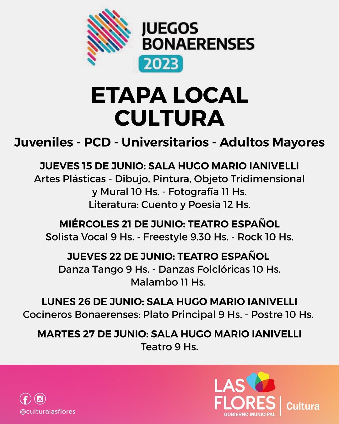 La Secretaría de Cultura informa que a partir del día 15 de junio se desarrollará la Etapa Local de los Juegos Bonaerenses 2023, en las categorías Juveniles, PCD, Universitarios y Adultos Mayores.