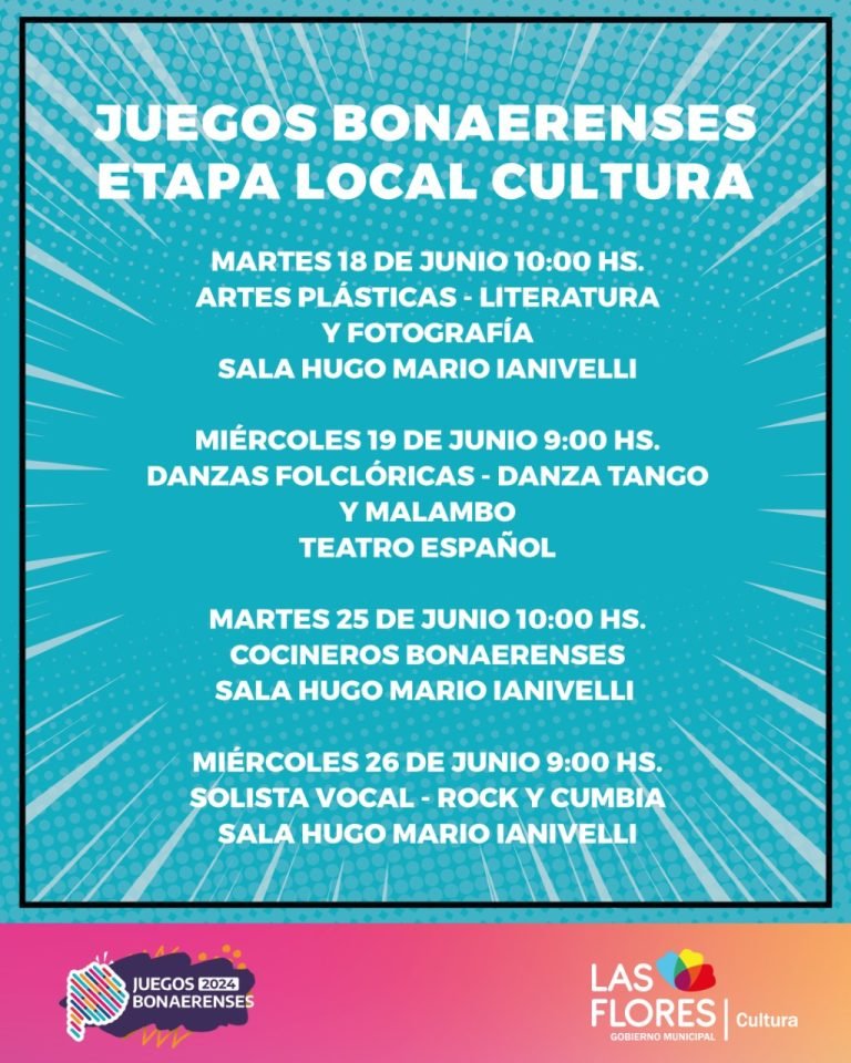 La Dirección de Cultura informa el cronograma de la Etapa Local correspondiente a los Juegos Bonaerenses 2024 para las categorías Juveniles, PCD y Adultos Mayores.