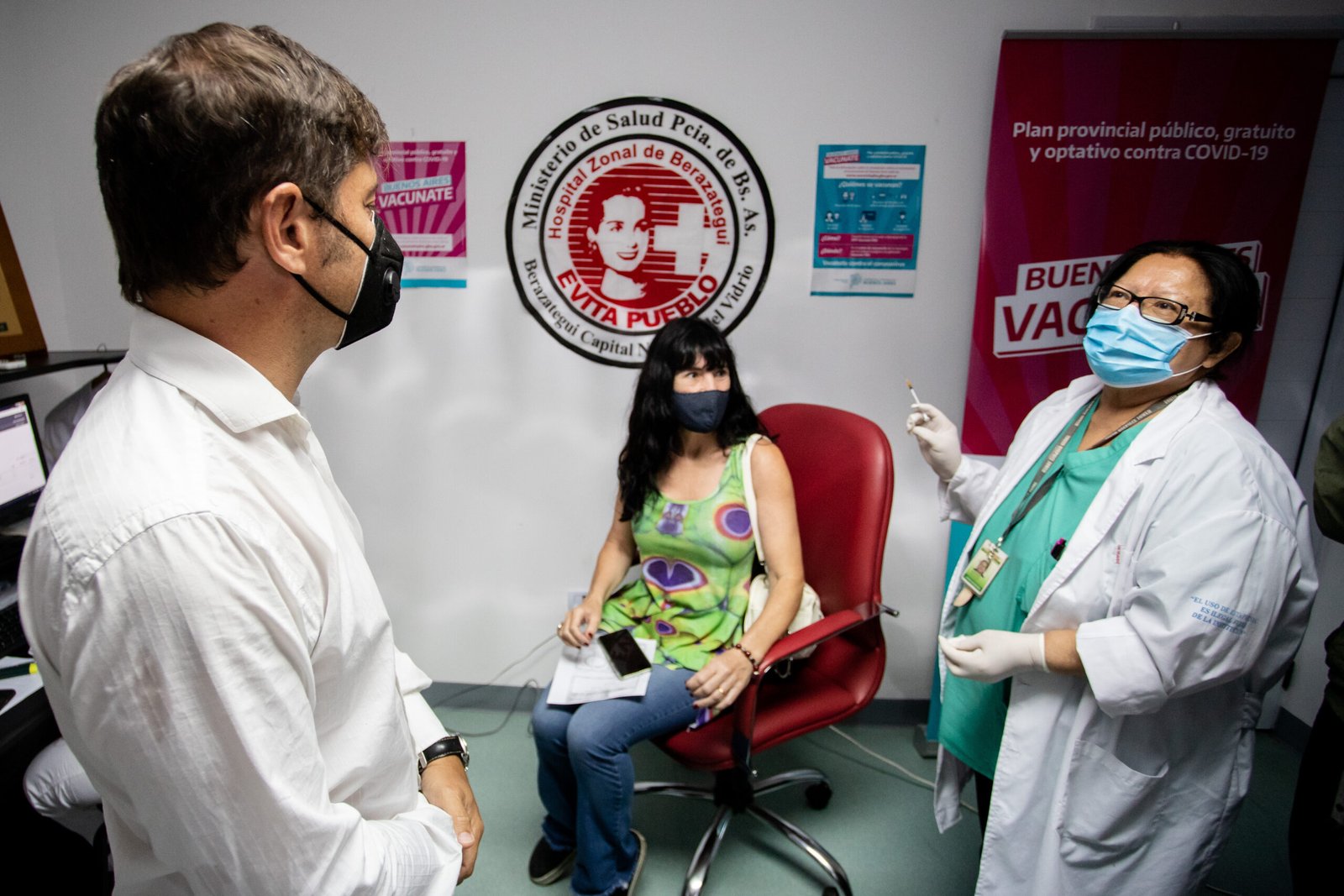 El gobernador de la provincia de Buenos Aires, Axel Kicillof, visitó el municipio de Berazategui, donde junto al ministro de Salud, Daniel Gollan, y al intendente Juan José Mussi, recorrió las instalaciones del Hospital Evita Pueblo, centro de salud en el que se está llevando adelante el plan público, gratuito y optativo de vacunación contra el Covid-19 en el distrito.