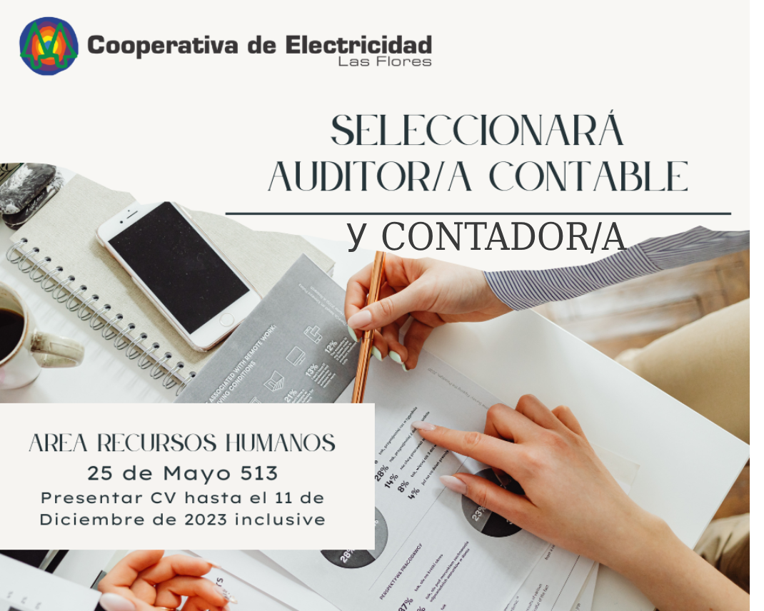 Modo de vinculación:. Contrato anualRequisitos:· Título Universitario · Residencia en la ciudad de Las Flores. Disponibilidad Horaria. Perfil AnalíticoLos interesados deberán enviar:1. Nota de presentación,2. Curriculum Vitae con foto3. Fotocopia de documento4. Fotocopia de Título Habilitante.5. Copia de la Matrícula Habilitante6. Plan de trabajo AnualLa información requerida se recibirá en la sede administrativa de la Cooperativa:Calle 25 de Mayo 513, de la ciudad de Las Flores, área de Recursos Humanos, hasta el lunes 11 de Diciembre de 2023 inclusive, en el horario de 8:00 a 13:30