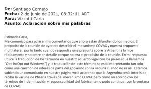 “Me comunico para aclarar mis comentarios que ahora están difundiendo los medios. El propósito de la reunión de ayer era describir el mecanismo Covax y nuestra propuesta multilateral; por lo tanto, cuando respondí a una pregunta sobre la Argentina, lo hice rápidamente y no entré en detalle porque no era el propósito de la reunión”, explica Cornejo en la carta enviada a Vizzotti, quien la hizo pública en la rueda de prensa que ofreció esta mañana en Casa de Gobierno.